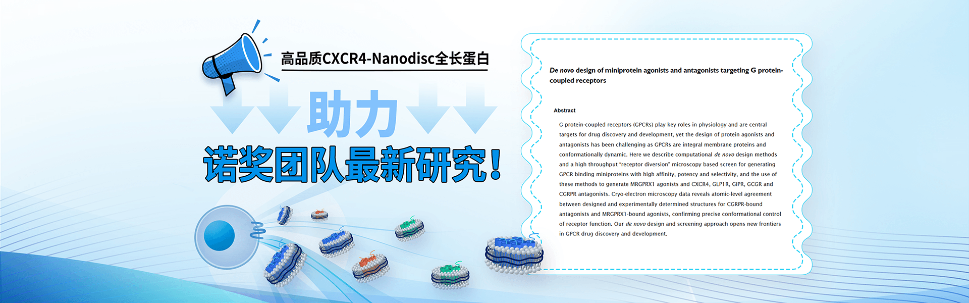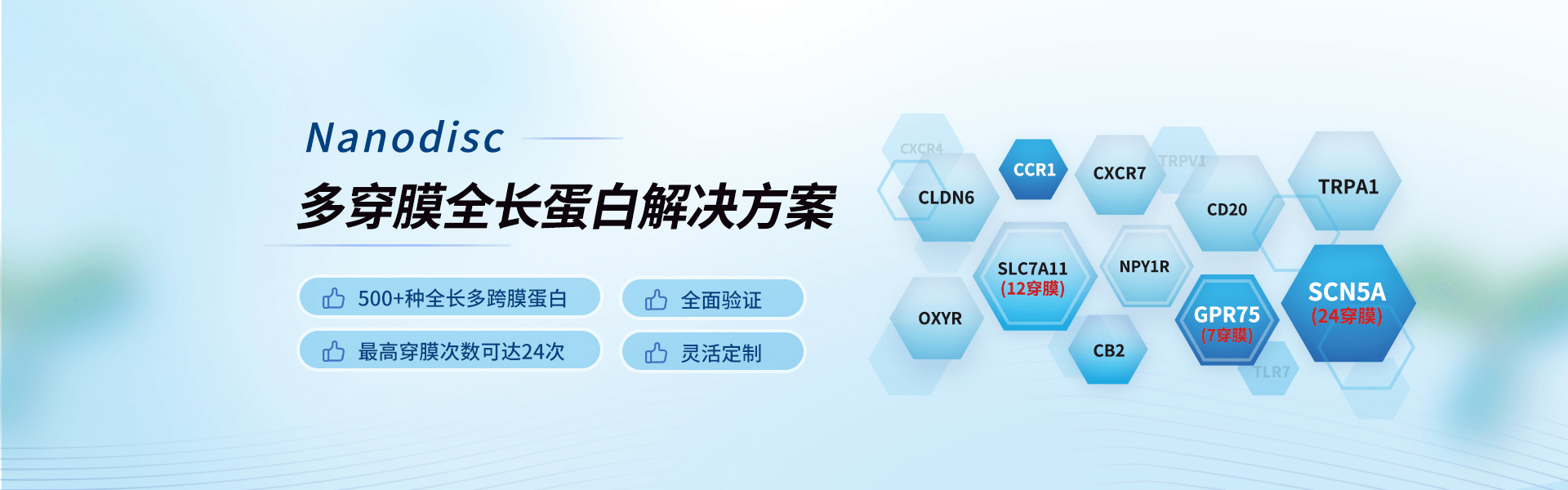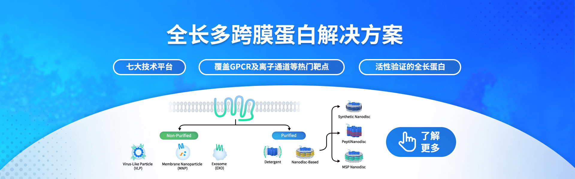 1. 单或多跨膜蛋白真核表达,制备和纯化平台,应用哺乳动物细胞表达系统,为药企客户提供最接近天然构象和功能验证的ECD或全长膜蛋白产品。公司现有5大功能性全长穿膜蛋白制备体系:纳米膜颗粒(MNP),病毒样颗粒(VLP)、外泌体(EXO)、去垢剂(Detergent)和合成纳米盘 (Synthetic Nanodisc),和上千个药靶蛋白的现货产品。