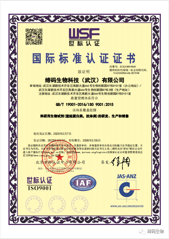 公司新闻喜获ISO9001认证! 日期: 2023-05-052024-09-05 Fei Ye 05 5 月 日前,缔码生物科技有限公司传来喜讯——公司正式通过北京世标认证中心有限公司ISO9001:2015质量管理体系认证!这是国际标准和行业市场对缔码生物的进一步认可,标志着缔码生物的质量管理水平迈上了一个新台阶、进入一个新阶段!ISO9001质量管理体系是所有国际标准中的核心标准,由“由ISO/Tc176(国际标准化组织质量管理和质量保证技术委员会)制定。该标准总结了当代世界质量管理领域的成功经验,是运用先进的管理理论、以简单明确的标准适用于各种组织的管理,可帮助组织实施并有效运行质量管理体系,是质量管理体系通用的要求或指南。可以说ISO9001质量管理体系是企业发展与成长之根本,认证ISO9001是企业规范和持续改进产品及服务质量必须做的功课。ISO 9001 Fei Ye 肝癌细胞治疗靶点|GPC3研究进展 缔码邀约-第六届求实抗体药物深度聚焦峰会