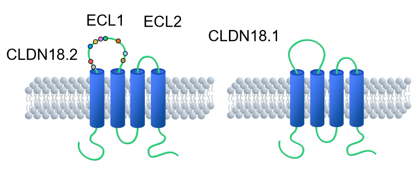CLDN18.2 and 18.1 are alternative splicing variants from the same gene. There are only 9 amino acid different within ECL1.