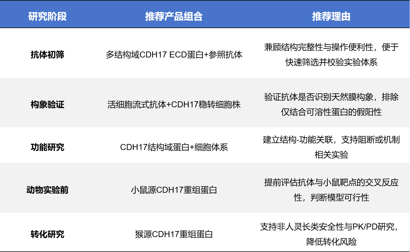 在研发实践中,CDH17 的 多结构域胞外区、构象依赖性以及跨物种差异,决定了其产品选型不能“一步到位”,而应按研究阶段逐步推进。