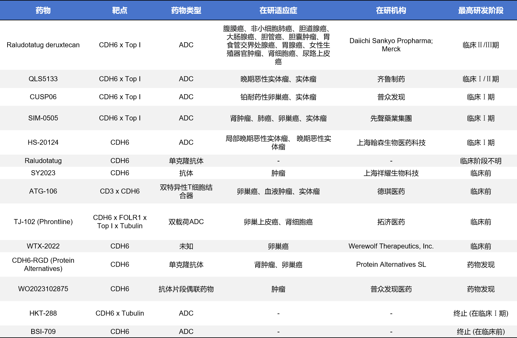 如前所述,CDH6是钙粘蛋白家族的II类经典成员,参与细胞-细胞黏附和组织发育。在正常成人组织中表达很低,但在多种实体肿瘤(尤其是卵巢癌、肾细胞癌)中高表达,与肿瘤侵袭、转移和较差预后显著相关,因此成为一个有前景的肿瘤治疗靶点。不完全统计,目前全球靶向CDH6的在研疗法有14款,5款处于临床阶段,4款处于临床前,2款处于药物发现,2款已终止。值得注意的是,进入临床的全是抗体偶联药物(ADC)。
