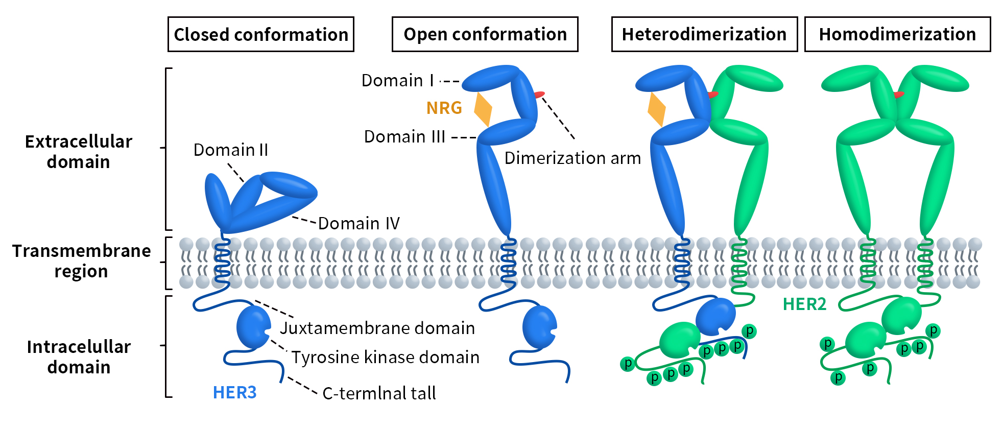 HER3能与配体heregulin和神经调节蛋白(NRG2)结合。如Figure 1所示,在没有配体的情况下,亚结构域II和IV之间的直接分子内相互作用使HER3处于无活性构象;当配体与子亚结构域I和III结合时,会诱发HER3胞外结构域的构象变化,使位于亚结构域II中的二聚化臂暴露在外。二聚化臂可以使HER3与另一个ERBB RTK成员或HER3单体进行分子间互作,形成异二聚体或同质二聚体[7][8]。