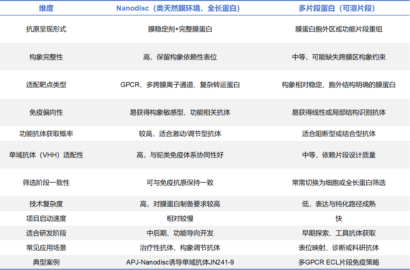 在实际抗体研发项目中,免疫原策略的选择应服务于最终研发目标。当靶点构象复杂、功能依赖跨膜区协同变化,或目标是获得具有调节活性的治疗性抗体时,Nanodisc往往具备更高的长期成功率;而在项目早期需要快速获取抗体资源、验证靶点可行性或进行表位探索时,多片段蛋白依然是高效且实用的选择。