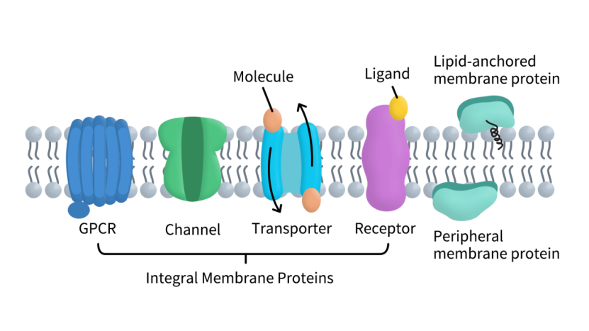在整合型膜蛋白中,有三个功能家族在科研和药物开发中尤为关键。首先是G蛋白偶联受体(GPCRs),这类蛋白可感知多种外部信号,如激素、神经递质和光信号,并将信息传递到细胞内部,调控免疫、神经、代谢及心血管等多种生理功能。GPCR也是药物开发的核心靶点,约占已批准药物靶点的三分之一。其次是离子通道(Ion Channels),通过调控钠、钾、钙等离子跨膜流动,参与神经信号传递、肌肉收缩和心律调控,广泛用于心血管疾病和神经疾病的研究与药物筛选。最后是转运蛋白(Transporters),其主要负责物质和离子的跨膜转运,维持细胞稳态,对药物吸收、分布和外排机制有直接影响,是研究耐药性和代谢性疾病的重要靶点。