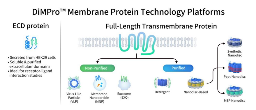 缔码生物科技有限公司是一家专注于可成药靶点临床前研发产品和服务的生物技术公司。既然聚焦可成药靶点,那膜蛋白,尤其是多穿膜蛋白的制备难点与挑战是缔码人不得不翻越的山。也正是基于这些挑战和应用需求,缔码生物经过长时间的摸索,成功搭建了基于哺乳动物细胞表达的DiMPro™功能性膜蛋白开发平台。该平台专注于膜蛋白,尤其是多跨膜蛋白的制备,旨在为抗体药物与小分子药物研发提供高质量的膜蛋白表达与制备解决方案。对于单穿膜蛋白,主要采取胞外结构域(ECD)融合蛋白表达系统。而针对全长多穿膜蛋白,如GPCR和Claudin系列蛋白,则采用缔码七大全长多跨膜蛋白表达平台,包括纯化膜蛋白平台和非纯化膜蛋白平台。纯化膜蛋白平台包括:Synthetic Nanodisc、MSP Nanodisc、PeptiNanodisc和去垢剂平台。非纯化膜蛋白平台包括:MNP(纳米膜颗粒)、VLP和外泌体平台。