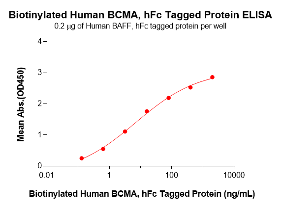 Figure 3. Biotinylated Human BCMA-hFc shows dose-dependent binding to immobilized Human BAFF-hFc, as detected by HRP–streptavidin, with an EC50 of 7.03 ng/mL.