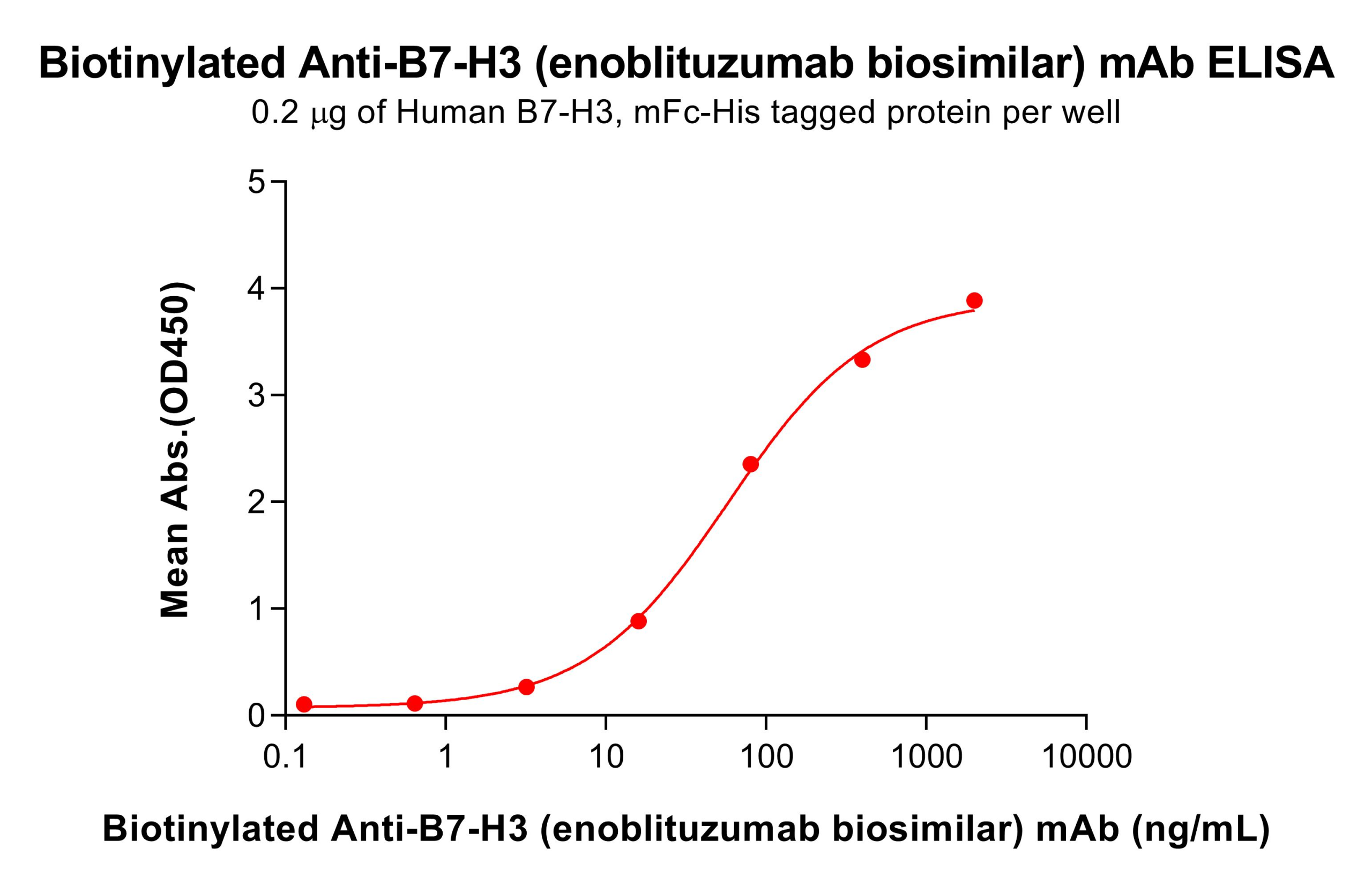Figure 4. Biotinylated anti-B7-H3 mAb (enoblituzumab biosimilar) exhibits linear binding to ELISA-immobilized Human B7-H3 mFc-His within 16-80 ng/mL.