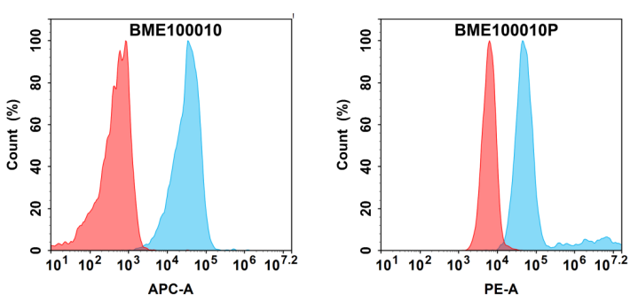 Figure 5. Flow cytometry comparison of Anti-B7-H3 (enoblituzumab biosimilar) mAb before and after PE conjugation on HEK293 cells. Blue: Anti-B7-H3; Red: isotype control.