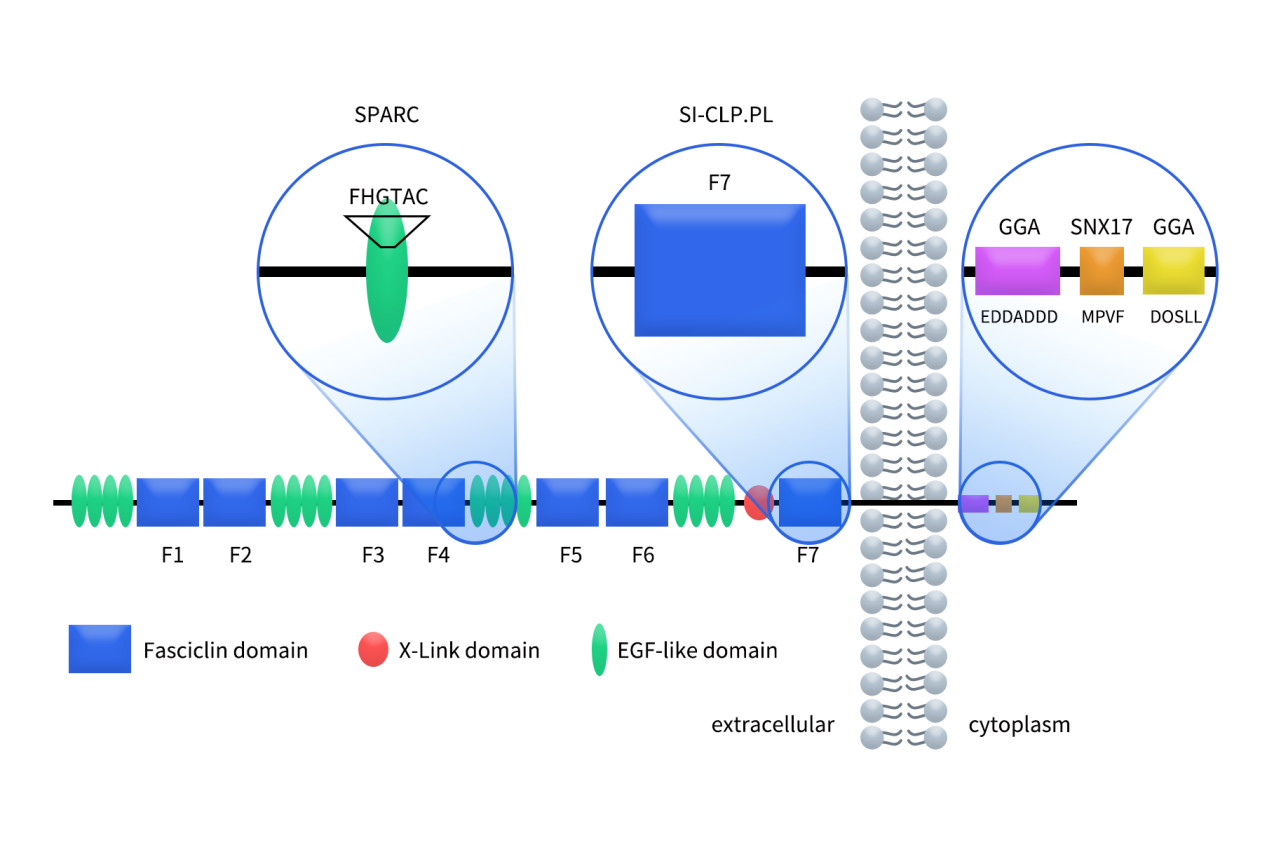 Stabilin-1是一个分子量高达280-310 kDa的巨型蛋白质,在人体内,这一跨膜蛋白由2570个氨基酸组成,通过其庞大的胞外区执行复杂的监测任务[1]STAB1胞外段(Extracellular Domain)为多功能的配体捕获器,占据了蛋白的大部分体积,呈现出重复的功能模块排列。STAB1胞外区包含7个Fasciclin(FAS1-7)结构域(每个结构域约140aa)、16个经典型表皮生长因子样(EGF-like)结构域以及1个C-型凝集素样连接结构域。EGF-like重复结构沿胞外区分布,在stabilin家族中常被描述为呈簇状组织。跨膜段(Transmembrane Region)是一个典型α-螺旋跨膜区,用于将受体锚定在质膜上。胞内尾部(Cytoplasmic Tail)虽短但包含多个功能性信号序列(如DDSLL、酸性簇等)用于与胞内分选适配蛋白(GGA1/2/3, SNX17等) 相互作用。
