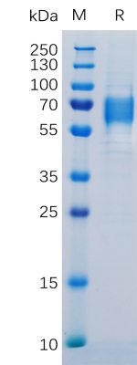 | Molecular Weight | The protein has a predicted molecular mass of 39.4 kDa after removal of the signal peptide.The apparent molecular mass of IL6R-His is approximately 55-70 kDa due to glycosylation. |